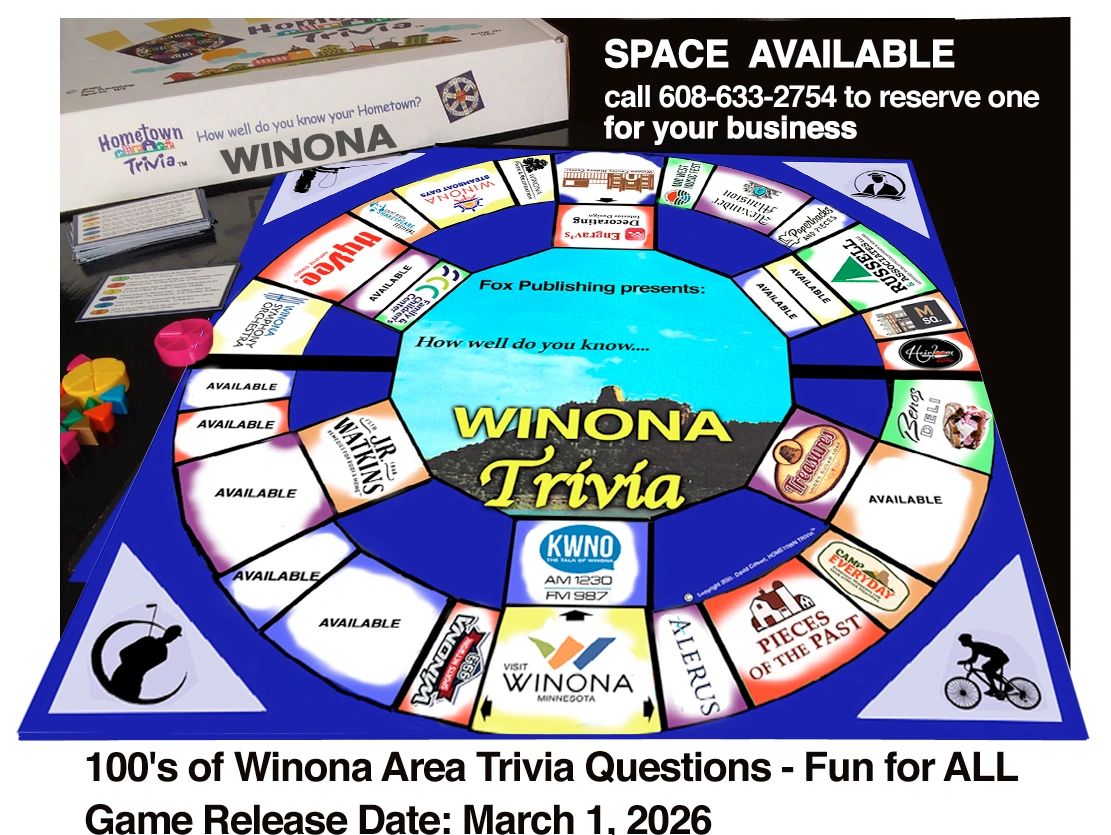 Our Hometown Trivia Game for Winona will have logos and names of local advertisers on the board, with hundreds of localized trivia questions in the game, including Advertiser Trivia Cards with 6 questions about each participating firm.